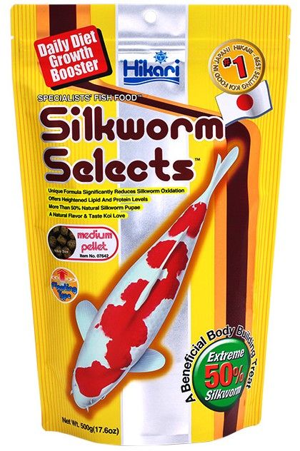 Hikari Silkworm Selects is a daily diet growth booster with 50% natural silkworm pupae. This specialty floating pellet fish food is intended to be a treat supplement to a regular diet. Feed as a daily treat to stimulate excellent growth in your koi.