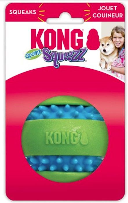 KONG Goomz balls enticing raised nubs massage teeth and gums while rewarding appropriate chewing behavior. Mixed textures and durable material encourage ongoing fun while satisfying natural instincts. The squeaker continues to extend playtime for indoor and outdoor sessions of interactive engagement.