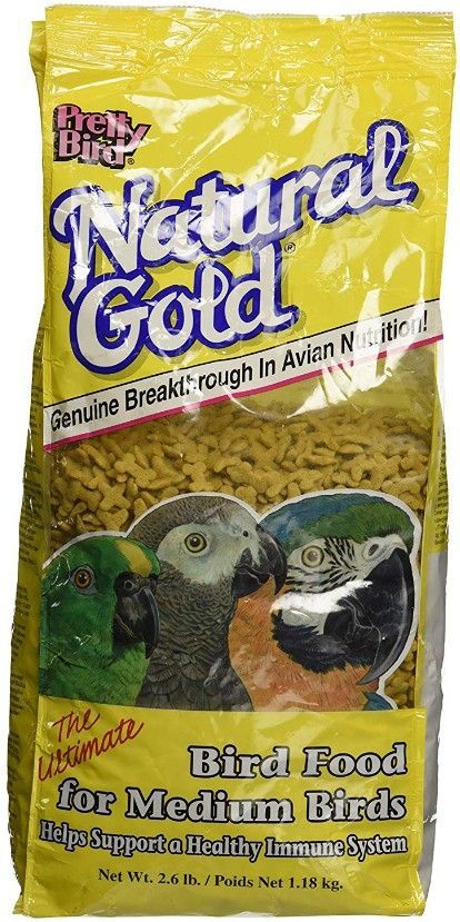 Pretty Bird Natural Gold Medium Bird Food features crunchy extruded natural corn colored morsels for smaller hookbill birds with no extra colors added and just lightly flavored. This innovative food contains Nucleotides which can improve your birds immune system.