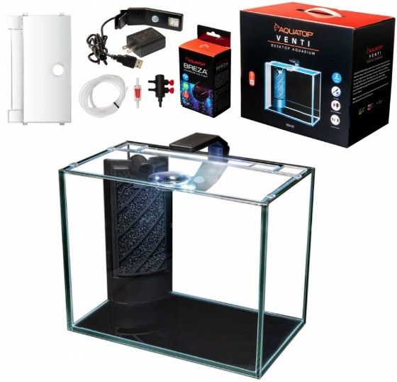 Aquatop Venti Desktop Aquarium Kit is the perfect small environment for Betta fish, shrimp, or other small freshwater invertebrates. This all-glass kit comes complete with LED Lighting, air-driven corner filtration, Aquatop’s AP-20 air pump, airline tubing, a check valve, bio foam for biological filtration, and a replaceable cartridge (part# VDA-02-RC) impregnated with activated carbon for mechanical and chemical filtration.