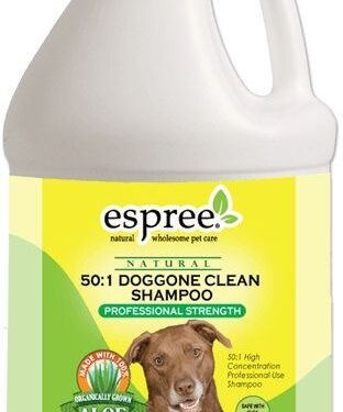Espree 50:1 Doggone Clean Professional Strength Shampoo is highly concentrated for extra cleaning power and longevity in each bottle. This natural pet shampoo is made with 100% organically grown Aloe Vera and safe to use with flea treatments.