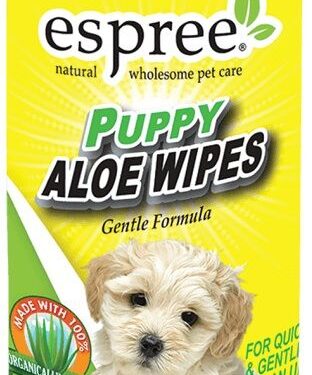 Espree Puppy Aloe Wipes allow quick, easy cleaning with hypo-allergenic, tear free ingredients and gentle cleansers for your puppys sensitive coat and skin. Natural Aloe Vera and Jojoba leave the coat soft and fluffy, with a long lasting baby powder fragrance.