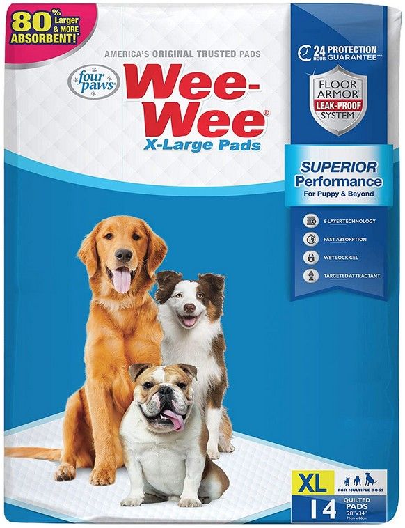 Four Paws X-Large Wee-Wee Pads are 80% larger and more absorbent than regular pads. This product features a proprietary leak-proof, 6 Layer Technology Floor Armor system to make housebreaking much easier. The quilted top layer locks in wetness to protect your floors and carpets from leaks. Made with Wet-Lock Gel for a 24 hour protection guarantee.