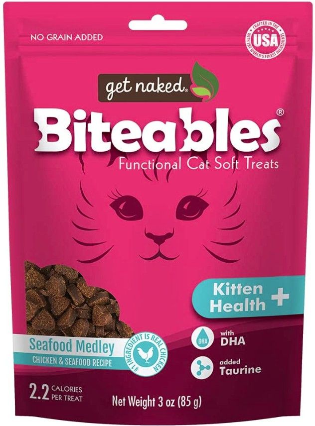 Getting off to a healthy start is the most important thing you can do for your kitten. Get Naked Biteables Kitten Health PLUS Soft Treats with extra protein, omega-3 fatty acids, and essential amino acids help support healthy growth and cognitive development through daily treating. These multifunctional soft treats are fortified with DHA, omega-3 fatty acids for healthy brain and eye development, and taurine, an essential amino acid that aids in vision, digestion, and heart muscle function. Your kitten will experience the healthy benefits of Biteables Kitten Health PLUS Soft Treats while enjoying the delicious chicken and seafood recipe.