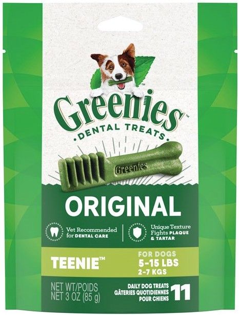 Greenies Teenie Dental Dog Treats are the Original Smart Treat! These delicious, safe and effective dental treats fight plaque and tartar buildup, maintain healthy teeth and gums, and provide fresh breath. With low fat and complete nutrition, they’re great for daily feeding.