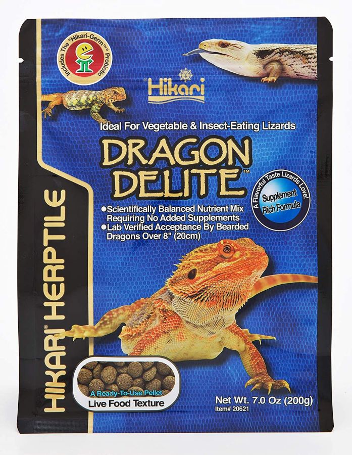Hikari Herptile Dragon Delite is a scientifically formulated, pellet food, containing all the necessary nutrients, including the probiotic “Hikari-Germ” that adult insect & vegetable-eating lizards, like Central Bearded Dragons, need to live a long and health-filled life.