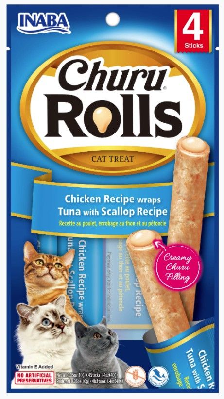 Churu Rolls are soft stick-shaped natural chicken treats seasoned with natural flavors, green tea extract and vitamin E. No grains, preservatives or artificial colors. Each package includes four individual treat packs to maintain maximum freshness.