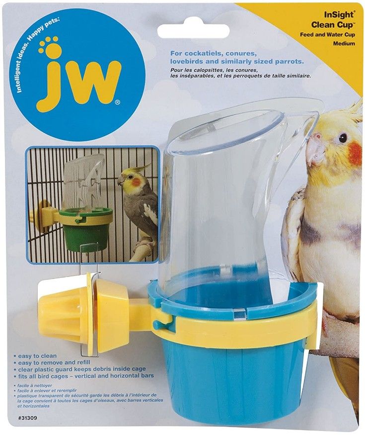 The JW Insight Clean Cup keeps food and debris from falling outside the cage. Place the shield and the cup a few inches into the cage to prevent the bird from shoveling out his seed onto the floor. Because it is clear, birds don’t mind sticking their heads into it (unlike opaque shields).