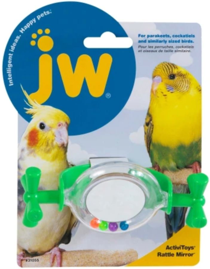 JW Insight Rattle Mirror Bird Toy is designed to stimulate the birds mind as well as its motor skills and to keep your bird vigorous and healthy. The rattle mirror turns and the beads roll. Has a large mirror in the center.