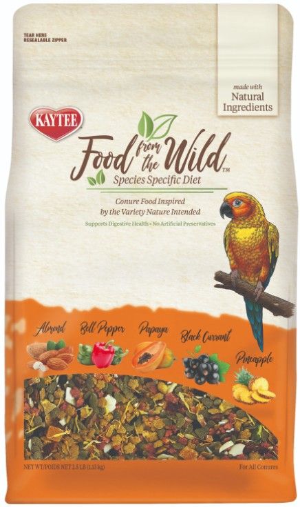 In the Wild, birds forage a complex range of nutrients from a variety of plants, fruits, nuts, and seeds to support optimal health. Foraging is an instinctive behavior your pet bird inherited from its ancestors. Inspired by the ancestral feeding habits of Conures, Food from the Wild blend is crafted with hand-selected bell peppers, papaya, pineapple, almonds, and black currants to encourage the healthy foraging activity your Conure needs. Extruded pieces offer species specific nutrition to support overall health. Food from the Wild food is formulated holistically to meet the unique nutritional needs of your Conure.