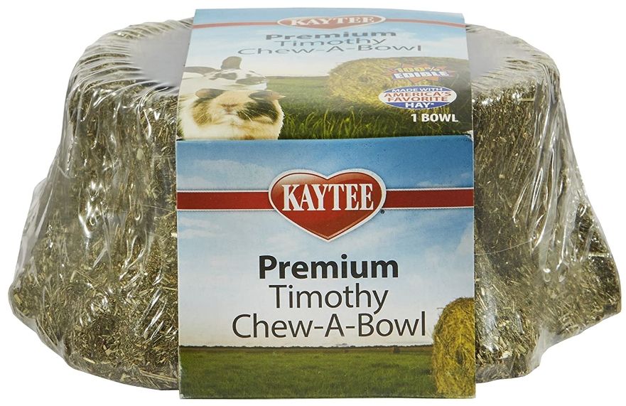 The Kaytee Premium Timothy Chew-A-Bowl is a 100% edible food bowl designed for pet rabbits (6 months and older), guinea pigs, and chinchillas. Made of pet-favorite Timothy Hay, this unique habitat accessory helps stimulate natural chewing activity and promote dental health.