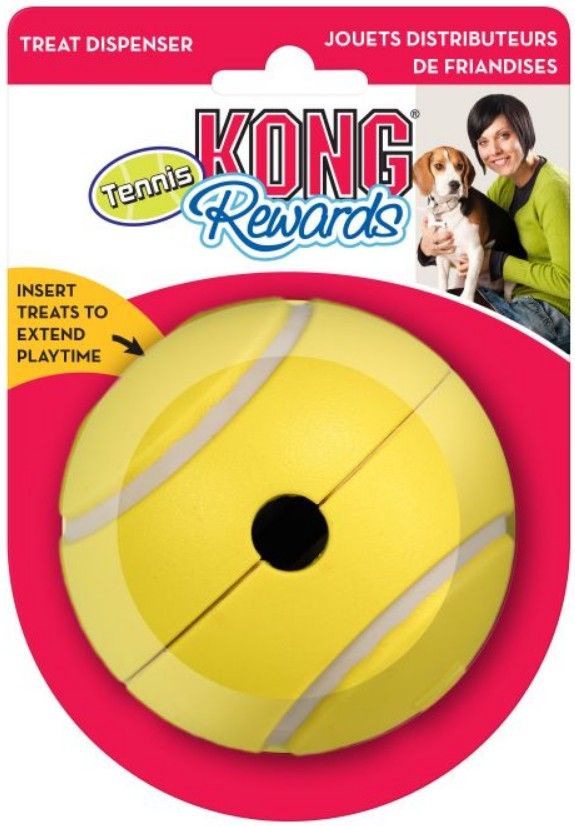 KONG Rewards Tennis adds a topspin to treat-dispensing that rewards with kibble treats and fun with every action-packed roll. Built from durable materials and featuring unpredictable movement this toy is sure to keep dogs engaged while providing mental and physical enrichment. An easy-fill funnel makes repeated use simple. Can also be used as a food bowl replacement to help manage weight.