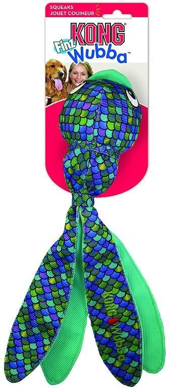 KONG Wubba Finz Blue Dog Toy is designed for long distance flinging. Two interior balls help the Finz bounce and squeak while the long floppy tails are made for shaking and tugging. You and your dog are sure to have fun with this bouncing flying fish.