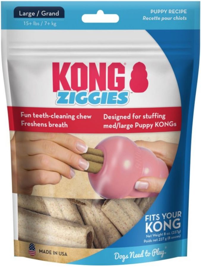 KONG Large Puppy Ziggies are a delicious and healthy treat made to meet the needs of puppies. These chewy treats are safe, highly digestible and freshen your dogs breath. When stuffed in your puppys small KONG Puppy rubber toy, Ziggies last twice as long as the leading chew treat.