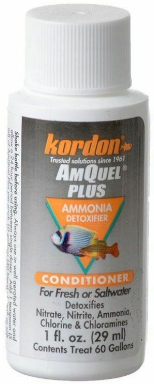 Kordon AmQuel Plus Ammonia Detoxifier water conditioner protects fishes and invertebrates by eliminating Nitrite, Nitrate, and all forms of Ammonia, Chloramines, and Chlorine. It removes fishs toxic pheromones and toxic organics and does not affect the waters pH. AmQuel Plus is safe to use in reef and live rock aquariums.