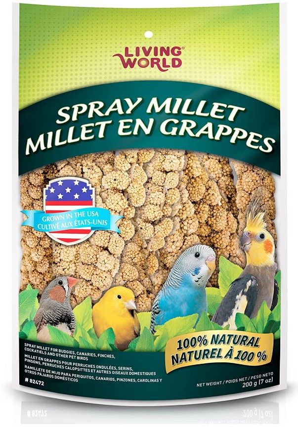 Living World Spray Millet is a natural sun-ripened spray. Ideal treat for: growing nestlings, young birds, breeding or molting adult birds. A natural treat for parakeets, canaries, finches, cockatiels and wild birds. Comes in a vacuum-sealed package to preserve freshness.