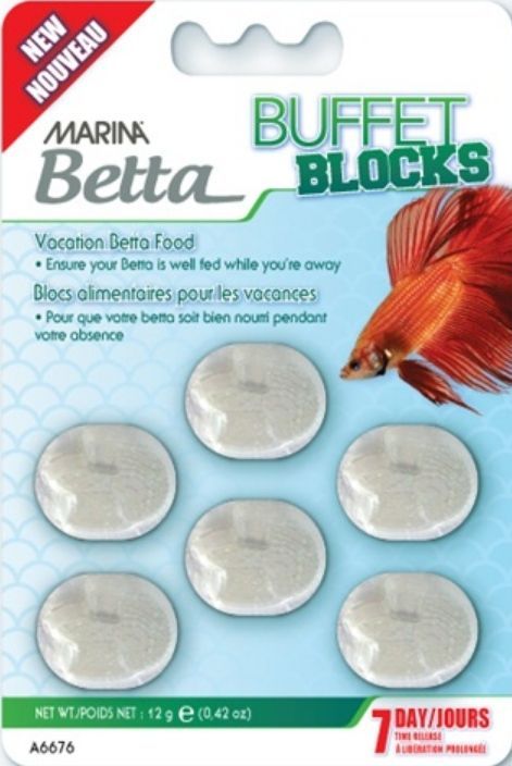 The Marina Betta Buffet blocks are the ideal vacation food. No need to worry about your Betta if you go away. The buffet block will slowly release all essential multi-vitamins and nutrients over a period of 7 days and this without clouding the water.