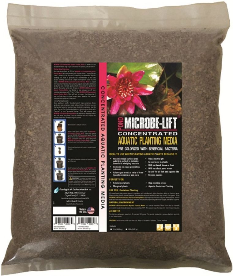 Microbe-Lift Aquatic Planting Media is made of 100% natural montmorillonite with an added beneficial bacteria to help with pond clarity. The neutral pH pebbles in Microbe-Lift Aquatic Planting Media contain beneficial bacteria, retain oxygen, and help absorb excess alkalinity for improved pond water quality. When used in a bog area, Microbe-Lift Aquatic Pond Plant Media helps reduce transplant shock, allow for more efficient utilization of light, water and nutrients and retain water keeping the bog moist but not waterlogged. Microbe-Lift Aquatic Planting Media will not break down, float, or cloud pond water. Microbe-Lift Aquatic Planting Media contains no algae-promoting nutrients, fertilizers, compost, peat, or harmful pesticides and is safe for use in ponds with fish.
