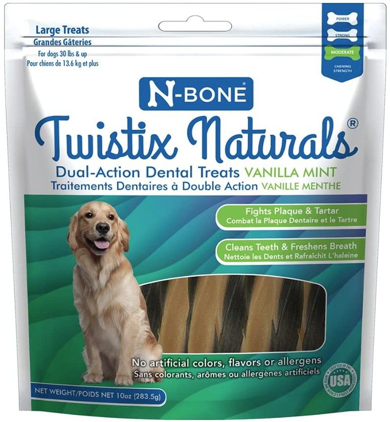 Twistix Naturals twisted dual-action dental chew fights plaque and tartar while chewing, and freshens the breath with real vanilla, mint, alfalfa, and parsley. Added pork collagen makes Twistix Naturals more digestible, moderately long-lasting, and simply irresistible. Our irresistible dual flavors have a dual purpose as well! The vanilla side of the stick is specially formulated to clean teeth, scrubbing away plaque and tartar as your dog chews. The mint side has added peppermint, parsley, and alfalfa to give your pup fresher breath. Twistix Naturals is rawhide, filler, and allergen-free with no artificial colors, or flavors added. Give your dog a natural dental chew thats good to him AND good for him.