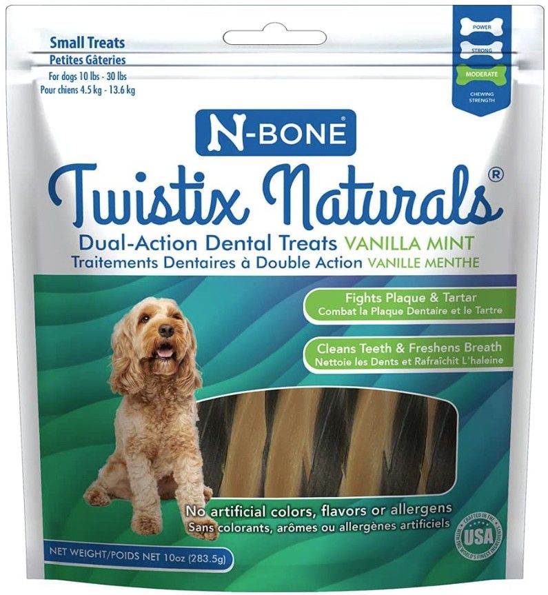 Twistix Naturals twisted dual-action dental chew fights plaque and tartar while chewing, and freshens the breath with real vanilla, mint, alfalfa, and parsley. Added pork collagen makes Twistix Naturals more digestible, moderately long-lasting, and simply irresistible. Our irresistible dual flavors have a dual purpose as well! The vanilla side of the stick is specially formulated to clean teeth, scrubbing away plaque and tartar as your dog chews. The mint side has added peppermint, parsley, and alfalfa to give your pup fresher breath. Twistix Naturals is rawhide, filler, and allergen-free with no artificial colors, or flavors added. Give your dog a natural dental chew thats good to him AND good for him.