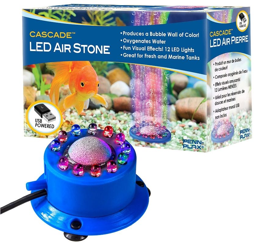 The Cascade LED Air Stone features 12 LED Lights that create a colorful ring of bubbles with constant ever-changing light effects, providing your tank with additional color and action, for you, as well as your fish! Great for Fresh and Marine tanks! It connects to an air pump and a check valve via line tubing. The LED Lights are powered separately from the air supply, and use a USB power cord (power supply block not included). Please Note: Air Pump, Line Tubing, and Check Valve not included. The Cascade LED Air Stone mounts to your tank via 3 sturdy and durable suction cups. In addition, you can secure it even further by using gravel or sand to cover it up to the top brim, leaving the LED Lights and Bubbler exposed.