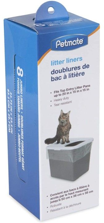 Petmate Top Entry Litter Pan Liners are heavy duty tear resistant disposable plastic liners that make litter box cleanup a snap. These disposable plastic liners make for easier litter box cleanup allowing pet parents to remove all the old litter in one quick step. Simply spread the liner over litter pan so that it overhangs rim on all sides. Press center of liner down to the bottom of the pan, and smooth outward. Fill the pan and liner with litter according to package directions. Sift out solid waste daily. To remove litter simply lift the liner from all sides, gather above pan and tie. Fits top entry litter pans up to 20 in x 15 in x 15 in. Sold in a convenient eight-count box.