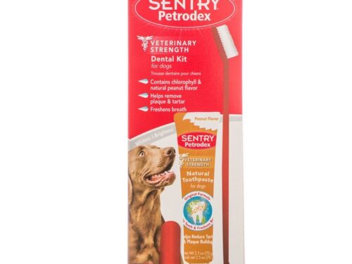 Sentry Petrodex Dental Kit for Dogs contains Petrodexs Veterinary Strength Natural Toothpaste, a double-sided toothbrush, and a finger brush for localized scrubbing. Regular cleaning of your dogs teeth is a crucial aspect in maintaining his oral health and comfort.