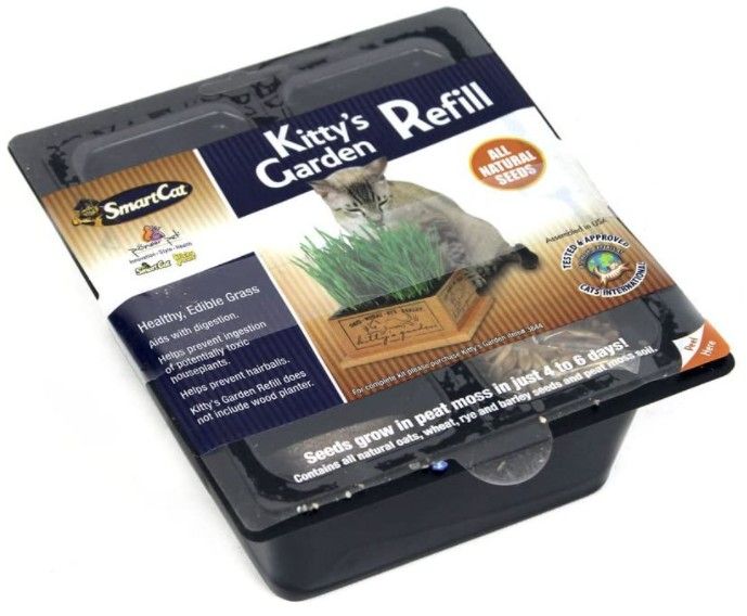 SmartCat Kittys Garden Seed Refill Kit allows you to restock your Kittys Garden with 100% organic oats, wheat, rye, and barley and help boost digestion and reduce the occurrence of hairballs. Seeds grow in 4-6 days with the included peat pellets.