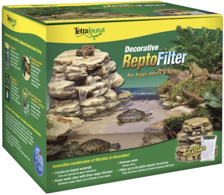The powerful 90 gph pump provides three-stage filter performance to keep your aquatic environment healthy. Dual function lid on the Decorative ReptoFilter keeps reptiles out and doubles as a basking platform.